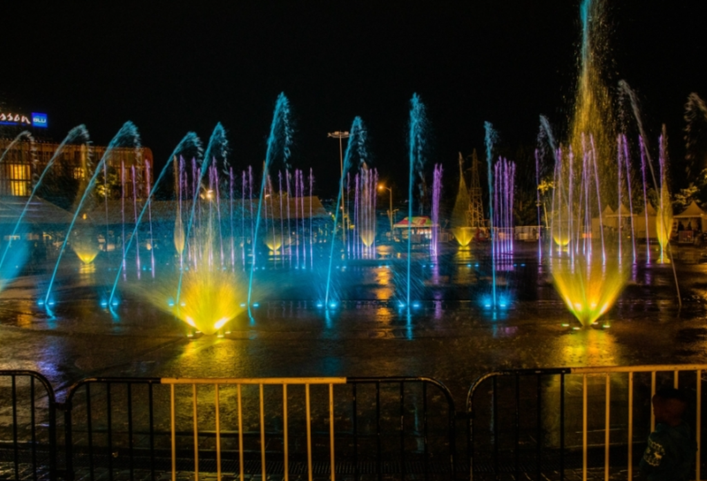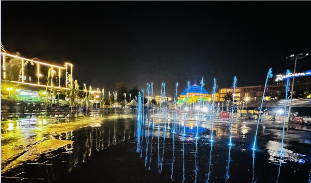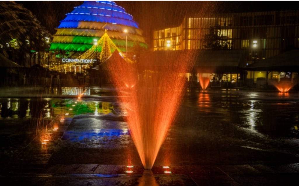 Kuri Kigali Convention Centre na ho hararimbishijwe cyane, aho ku mbuga ihari hashyizwe amatara n’amazi bamwe bavuga ko adasanzwe, bagendeye ku kuntu aba azamuka mu kirere ahinduranya amabara.